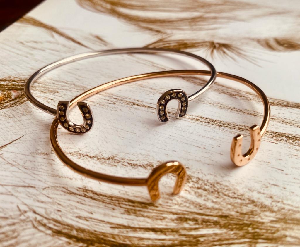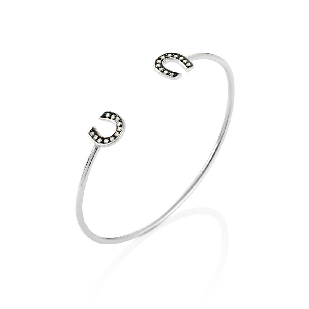 Bracele em Ouro Branco 18k com ferraduras em ródio negro com 11 diamantes/brilhantes de 1 ponto cada com 16cm de diâmetro.