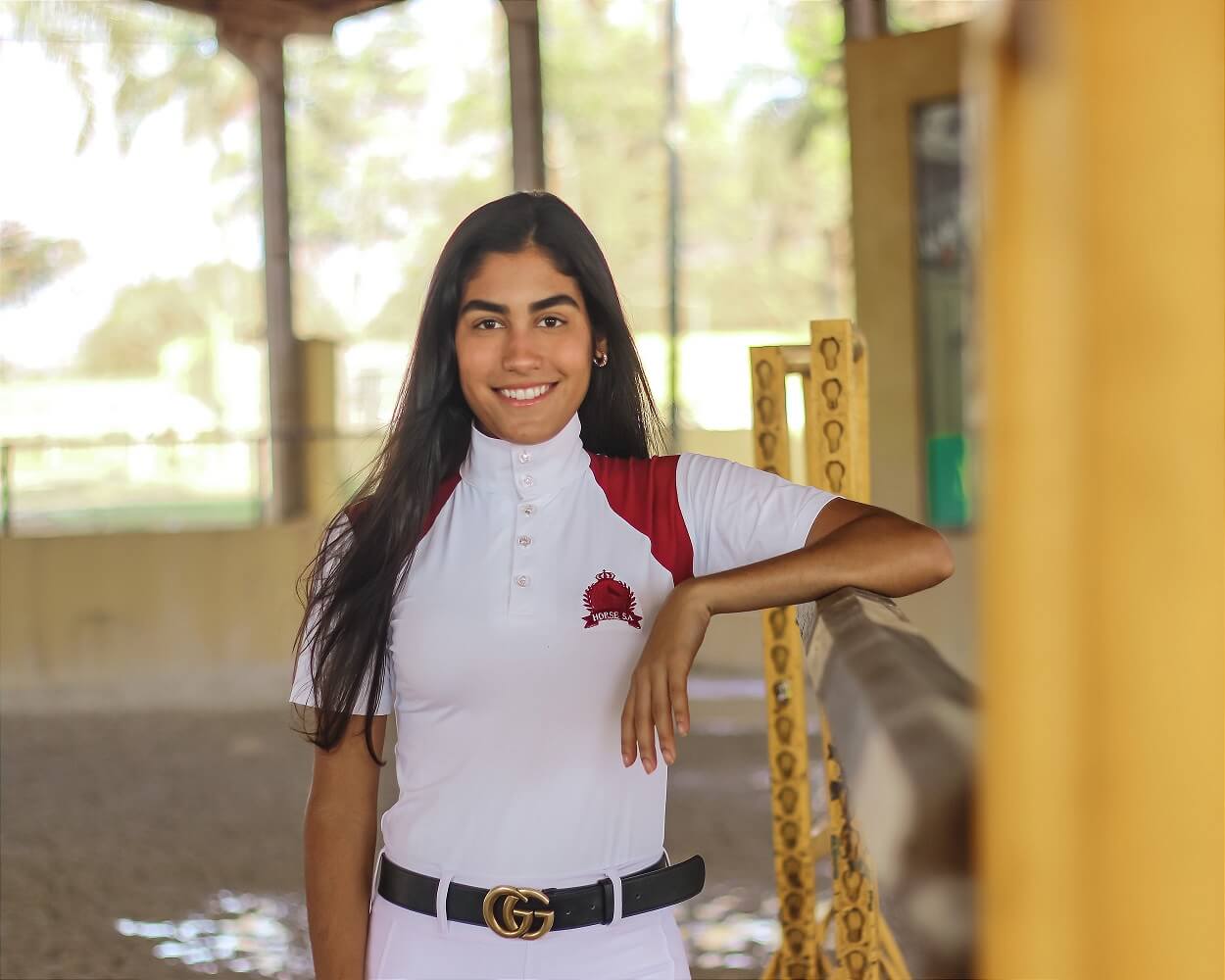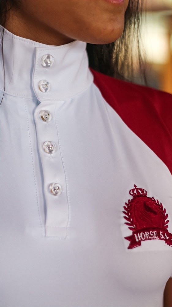 Camisa Hipismo Prova Manga Curta Branca com Vinho Horse SA, com Recorte Especial em Vinho, feita em Malha Tecnológica geladinha que bloqueia a passagem dos raios solares UVA e UVB 50+, protegendo a pele do sol. Malha bem leve, de fácil absorção ao suor, te ajudando na transpiração deixando a pele respirar, com secagem rápida. Extremamente confortável, suavidade e durabilidade, além de um Design Moderno e antenado da Moda Equestre. Expressa toda sua personalidade no detalhe também, do fechamento com botões em acrílico com ponto de luz em strauss lindíssimo, dando todo o charme para a peça e te destacando no seu dia de Campeonato de Hipismo. Bordado especial na parte do peito e costas na cor vinho para compor a sinergia do look e assinar a peça exclusiva da loja Horse SA.