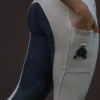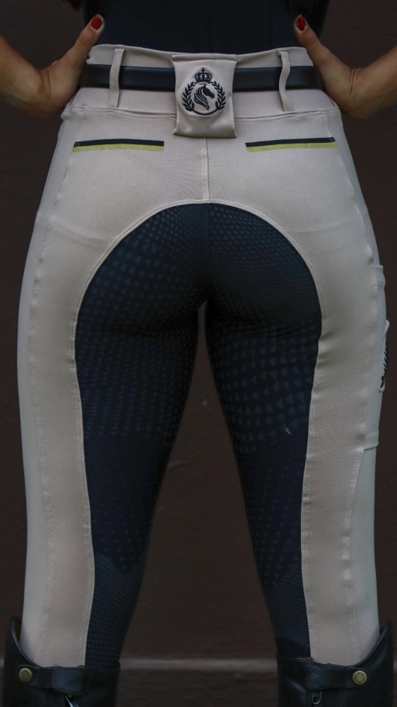 Micro pigmentos de silicone na parte interna da perna que ajuda aderir ao cavalo.