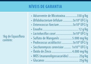 EQUUSFLORA é um núcleo mineral com efeito pré e probiótico para equinos. Contém cepa específica da levedura saccharomyces cerevisiae (KA500), que apresenta efeito otimizador do sistema digestivo. Possui também adsorvente de micotoxinas, é indicado para equinos, asininos e muares em qualquer fase da vida.