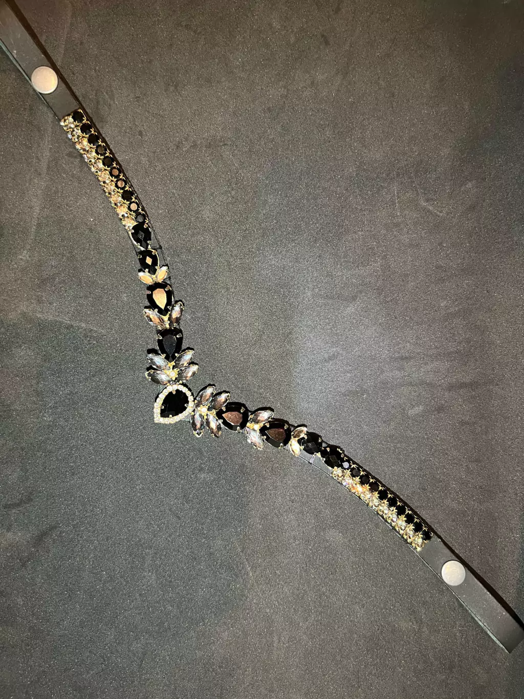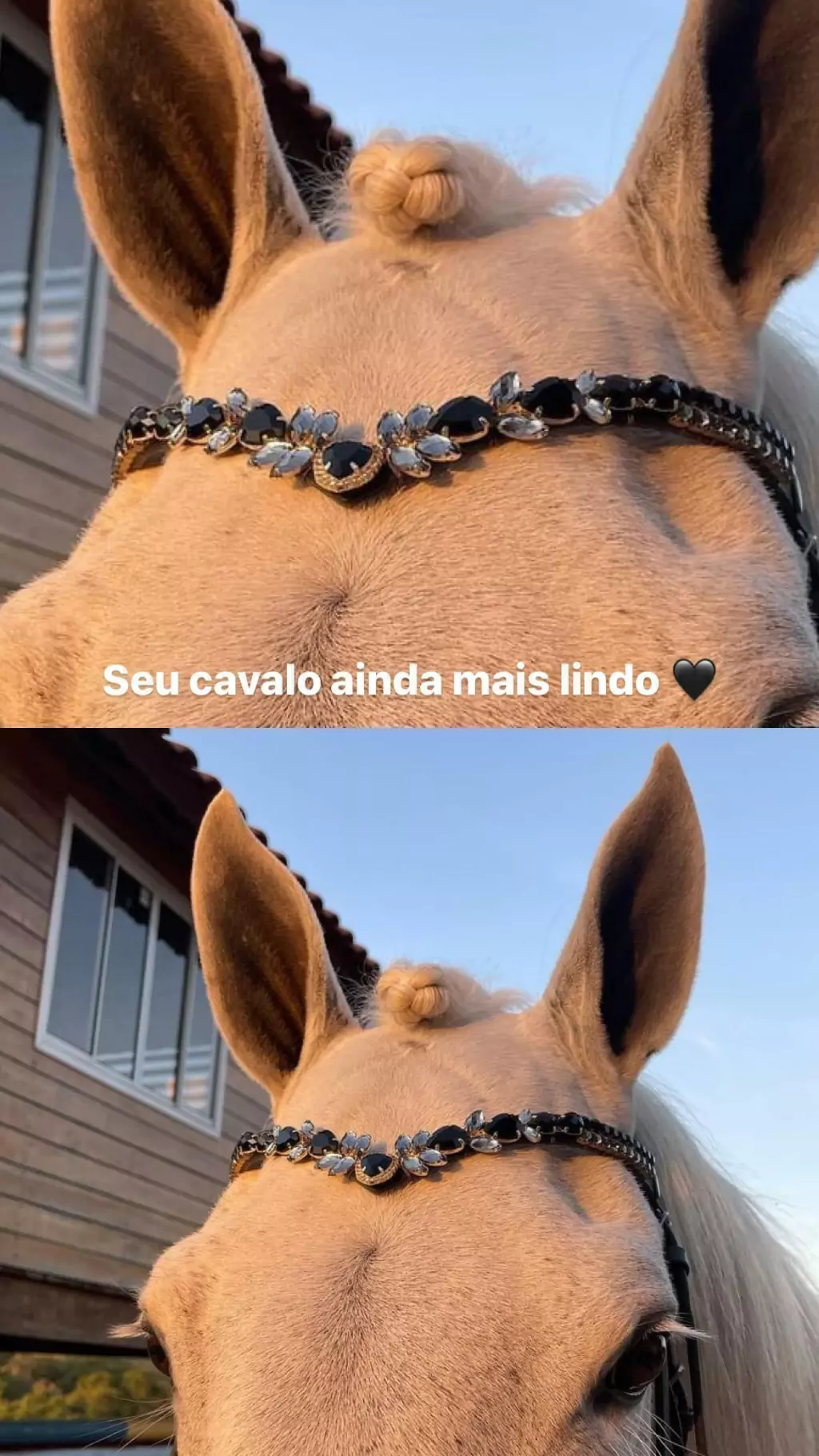 Design Elegante: A combinação de cores preta e prateada, junto com as pedrarias, confere um toque de sofisticação ao visual do seu cavalo.
